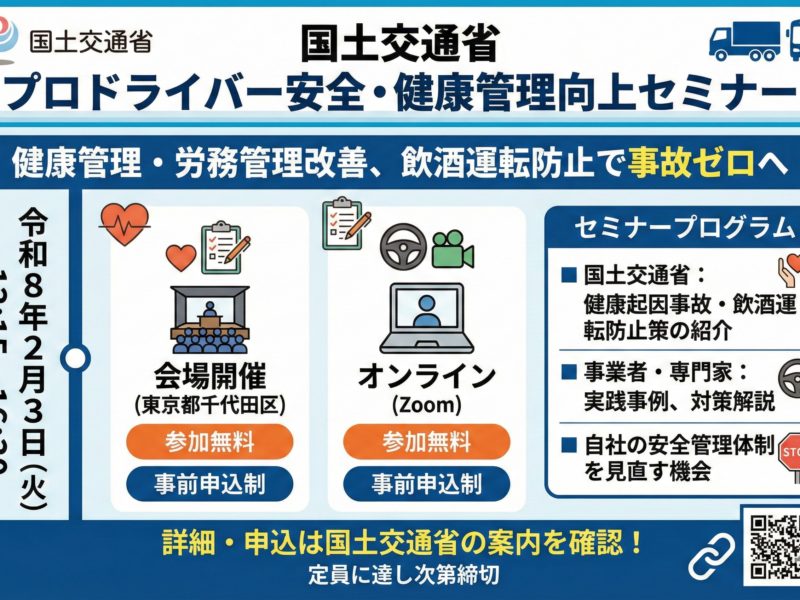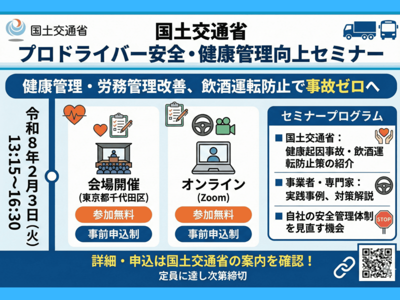続きを読む国土交通省は、プロドライバーの健康管理・労務管理の改善および飲酒運転防止を通じた事故防止対策として、関係事業者向けのセミナーを開催します。セミナーは事業者が今後の安全対策の参考とすることを目的としてお …