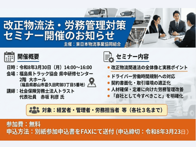 続きを読む東日本物流事業協同組合では、2024年の制度改正を起点に段階的に施行が進む「改正物流関連法」への対応を目的として、組合員向けセミナーを開催いたします。 改正物流関連法は、運送事業における労務管理、取引 …