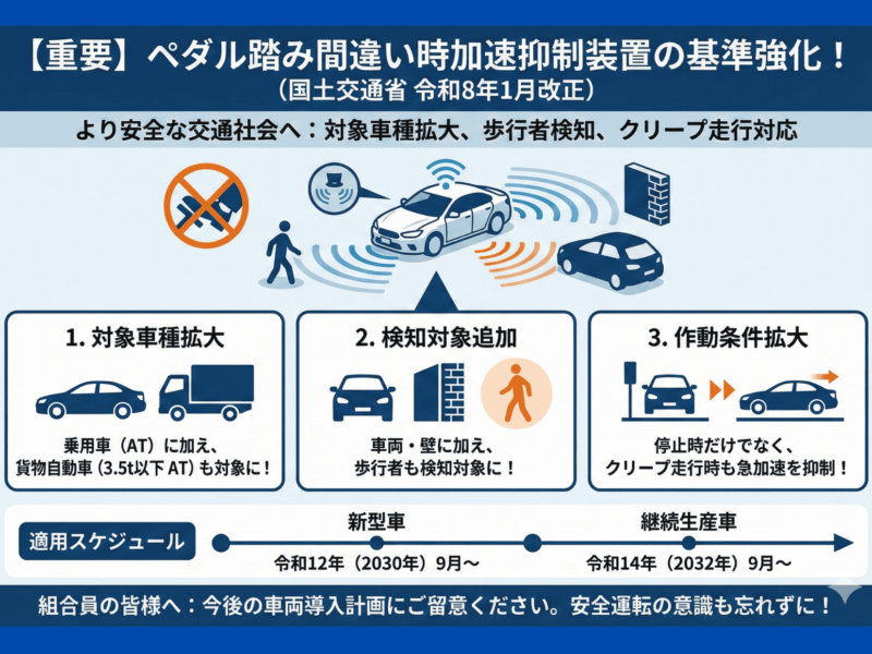 続きを読む令和8年1月9日、国土交通省より「道路運送車両の保安基準」の改正が発表されました。 近年、高齢運転者等によるペダル踏み間違い事故が社会問題となっていますが、今回の改正により、「ペダル踏み間違い時加速抑 …