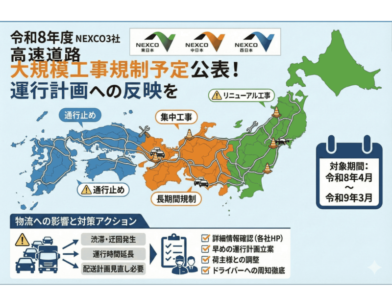 続きを読む令和7年11月20日、国土交通省 物流・自動車局より「大雪時の大型車立ち往生防止対策」について発表がありました。 過去、関越道や北陸道等において発生した大規模な車両滞留事案を踏まえ、今冬も「車両対策」 …