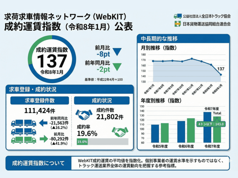 続きを読む公益社団法人全日本トラック協会と日本貨物運送協同組合連合会は、令和7年12月1日、同年11月分の「求荷求車情報ネットワーク(WebKIT)」成約運賃指数を発表しました 。 最新のデータによると、**1 …