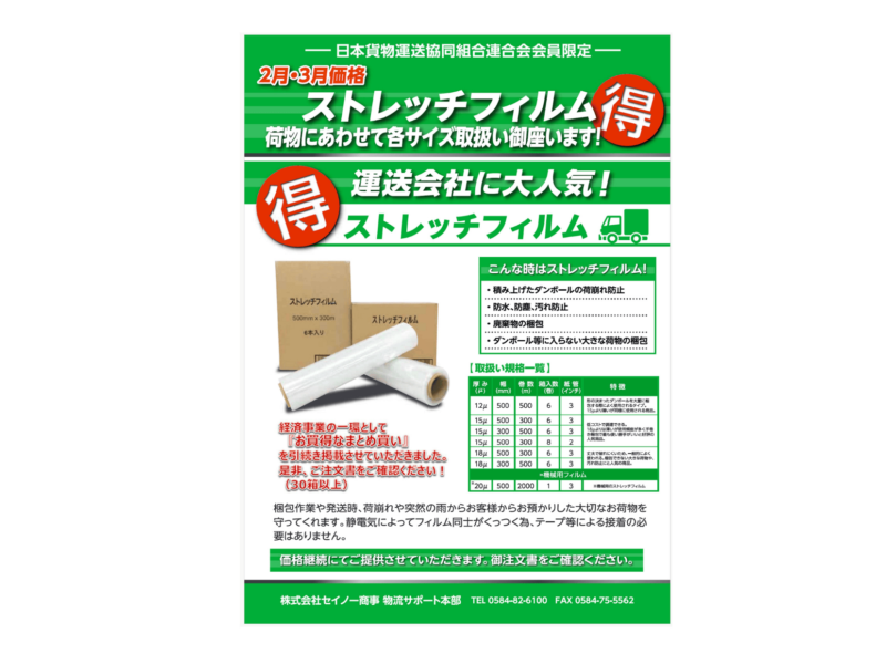 続きを読むいつも組合事業をご利用いただきましてありがとうございます。2026年2月分~3月分ストレッチフィルムの価格表兼注文書を会員専用ページにアップしましたので、ぜひご利用ください。尚ダウンロードファイルはP …