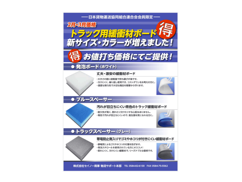 いつも組合事業をご利用いただきましてありがとうございます。2026年2月~3月分トラック用緩衝材ボードの価格表兼注文書を会員専用ページにアップしましたので、ぜひご利用ください。尚ダウンロードファイルは …