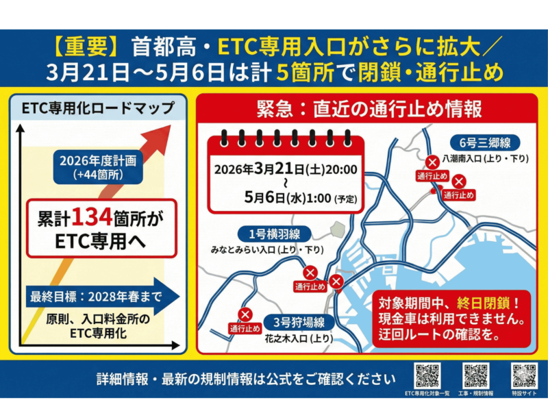 続きを読む首都高速道路株式会社より、ETC専用入口の拡大および、長期間の通行止めを伴う料金所リニューアル工事に関する情報が公表されています。 日頃より首都高を利用されるドライバーの皆様は、運行計画への影響が予想 …