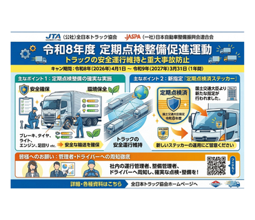 続きを読む全日本トラック協会を通じ、日本自動車整備振興会連合会(日整連)が実施する「定期点検整備促進運動」に関する通知がありましたのでご案内いたします。 トラックの安全運行を維持し、路上での故障や重大事故を未然 …