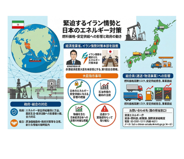 続きを読む経済産業省より、緊迫化するイラン情勢を受け、赤澤経済産業大臣を本部長とする「イラン情勢を踏まえたエネルギー対策本部」が設置され、第1回の会合が開催されたことが公表されました。 中東情勢の変化は、当組合 …