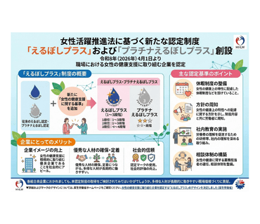 続きを読む令和8年(2026年)4月1日より、女性活躍推進法に基づく新たな認定制度として、職場における女性の健康支援に取り組む企業を認定する「えるぼしプラス」および「プラチナえるぼしプラス」が創設されます。 こ …