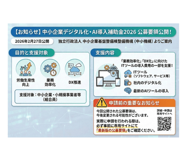続きを読む独立行政法人 中小企業基盤整備機構(中小機構)より、「中小企業デジタル化・AI導入補助金2026」の公募要領が公開されましたのでご案内いたします(2026年2月27日公開)。 本補助金は、組合員企業の …