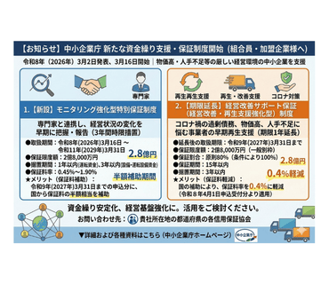 続きを読む令和8年(2026年)3月2日、中小企業庁より、物価高や人手不足などの影響で厳しい経営環境にある中小企業を支援するため、新たな保証制度の開始および既存制度の延長が発表されました。 事業の立て直しや新た …