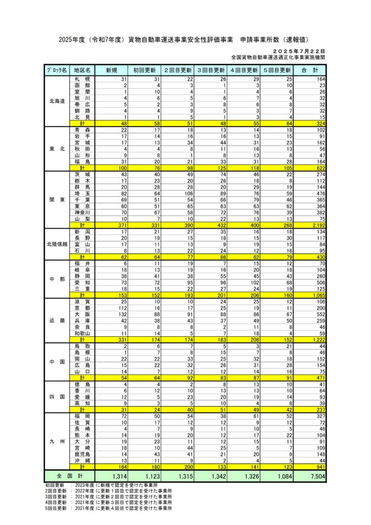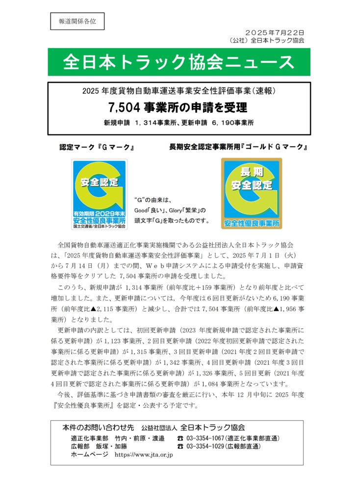 全日本トラック協会は7月22日、「2025年度貨物自動車運送事業安全性評価事業」(Gマーク制度)について、申請資格要件等をクリアした7,504事業所の申請を受理したと発表しました。新規申請は1,314事業所で、前年度に比べて159事業所増加しました。