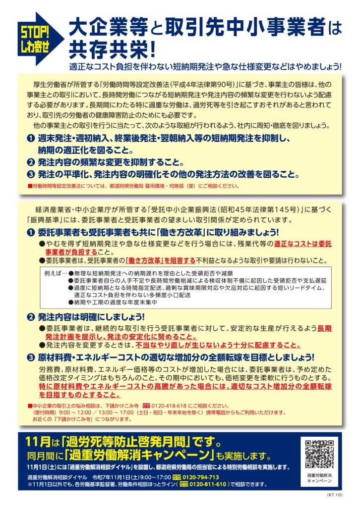 今年の11月は、厚生労働省、中小企業庁、公正取引委員会が連携して取り組む「『しわ寄せ』防止キャンペーン月間」です。このキャンペーンは、大企業や荷主など、取引先から中小事業者への不当な負担(「しわ寄せ」)を防ぎ、中小企業の「働き方改革」を実質的に進めることを目的としています。