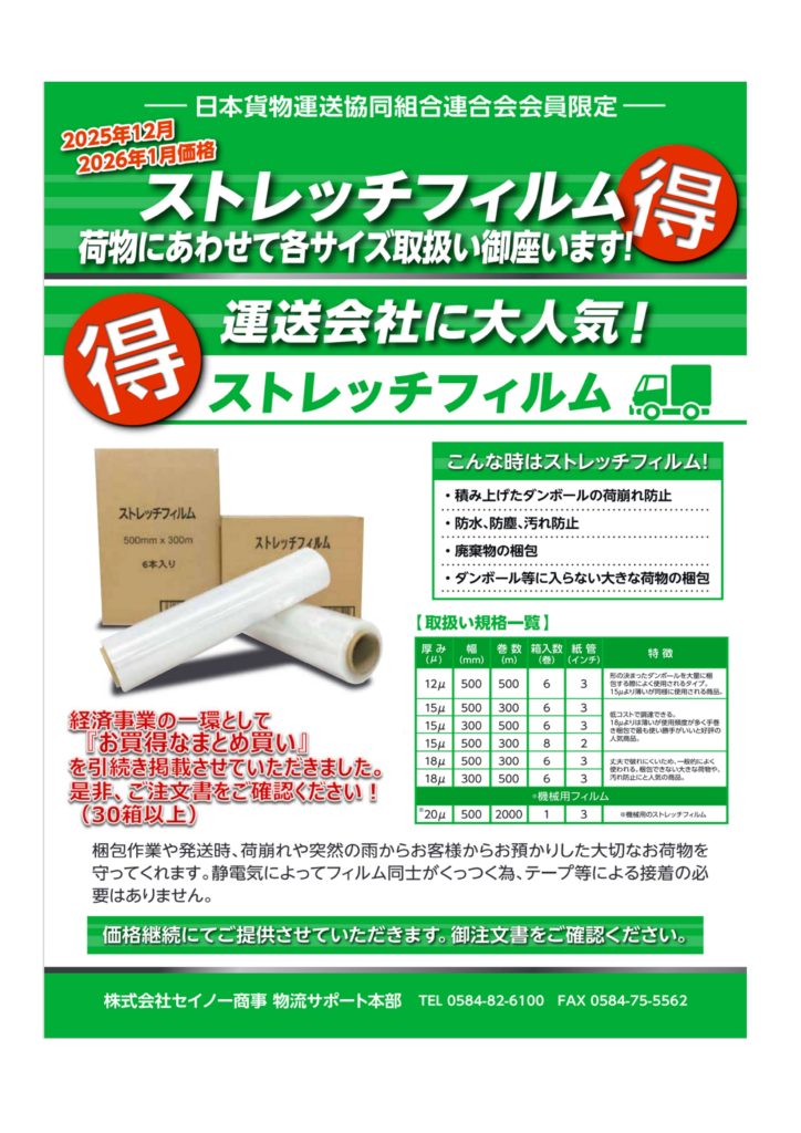 いつも組合事業をご利用いただきましてありがとうございます。2025年12月分~2026年1月分ストレッチフィルムの価格表兼注文書を会員専用ページにアップしましたので、ぜひご利用ください。尚ダウンロードファイルはPDFファイルになりますので、Adobe Acrobat Readerをインストールしてご覧ください。会員専用ページのパスワードについては、会報の最終ページに記載されております。注文書はFAX(024-923-8623)で送信ください。