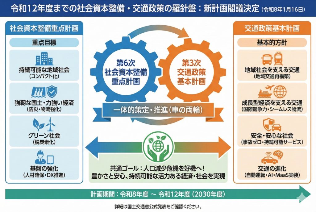 令和8年1月16日、政府は今後数年間の日本のインフラ整備と交通施策の指針となる「第6次 社会資本整備重点計画」および「第3次 交通政策基本計画」を閣議決定しました。