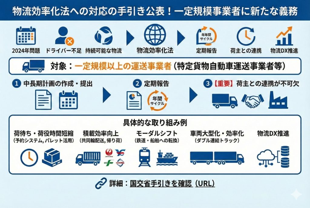 ▶ 【国土交通省】特定貨物自動車運送事業者等の物流効率化法への対応の手引き(リンク) https://www.mlit.go.jp/seisakutokatsu/freight/content/001976793.pdf