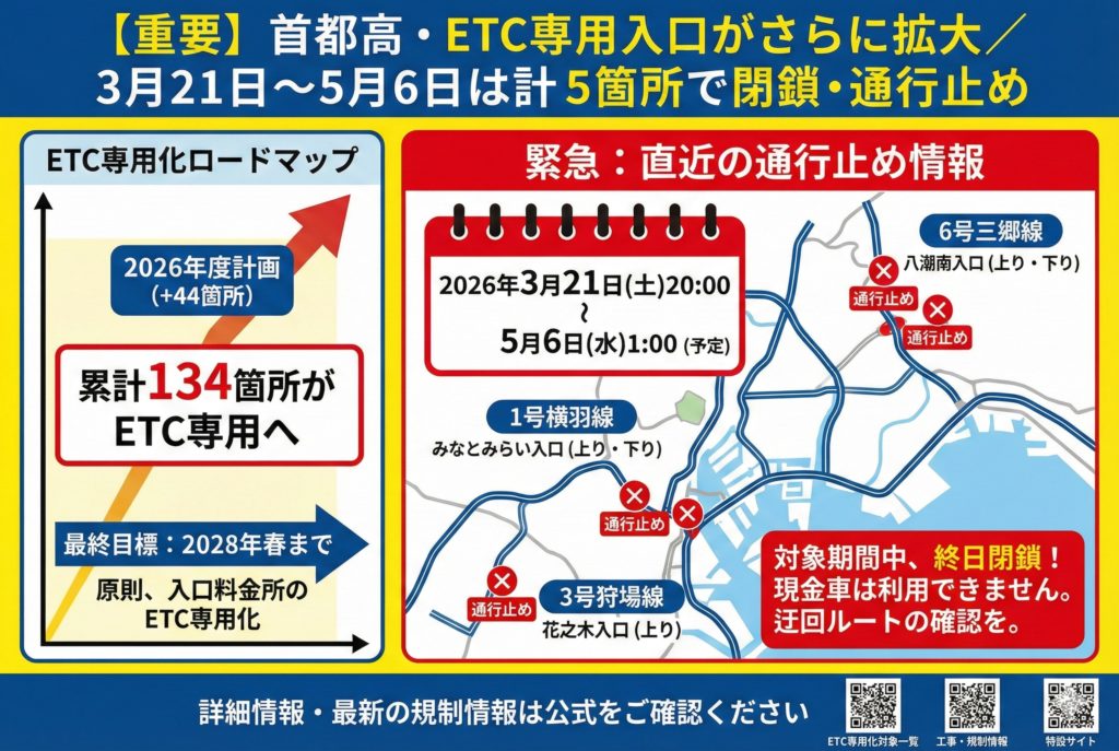 【今後のETC専用化について】 首都高では、2028年春までに本線料金所などを除き、入口料金所のETC専用化を目指しています。 現金車は利用できなくなりますので、車載器の搭載・カードの確認を改めて徹底してください。