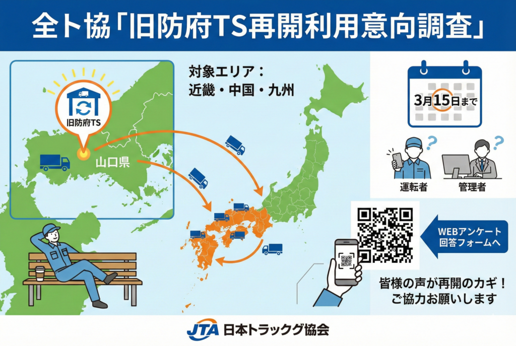 現在、全日本トラック協会(全ト協)において、「旧防府トラックステーション(山口県)」が再開した場合の利用意向や動向に関するアンケート調査が実施されております。