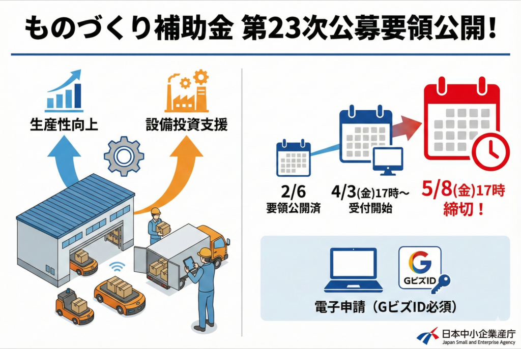 中小企業庁より、2月6日付で「ものづくり・商業・サービス生産性向上促進補助金(通称:ものづくり補助金)」の第23次公募要領が公開されましたのでご案内いたします。
