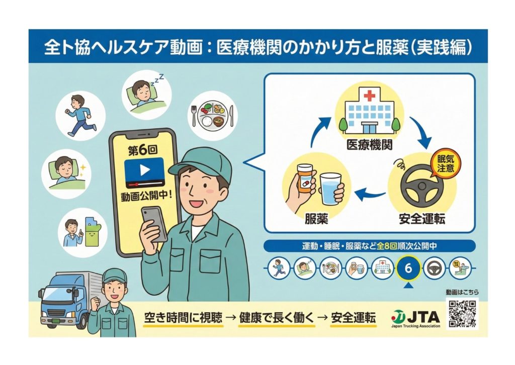 全日本トラック協会(全ト協)より、ドライバーの健康増進に向けた取り組みの一環として、令和7年度「ドライバーの押さえておきたいヘルスケアポイント動画」の第6回が公開されましたのでお知らせいたします。