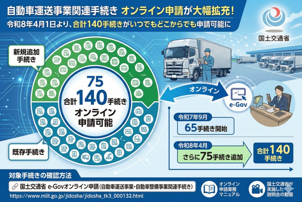 政府が推進するデジタル社会の実現に向けた取り組みの一環として、令和8年4月1日(火)より、自動車運送事業に関連する手続きのオンライン申請がさらに拡充されますので、ぜひご活用ください。