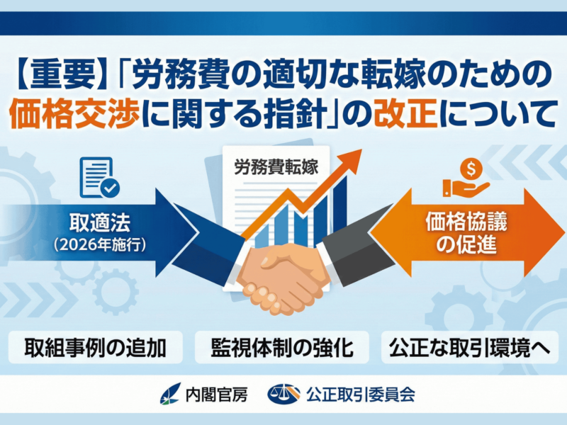 〜2026年1月施行「取適法」に合わせた見直しと取組事例の追加〜 内閣官房および公正取引委員会は、令和7年12月26日、発注者・受注者双方が労務費を適切に価格転嫁するための「労務費の適切な転嫁のための …
