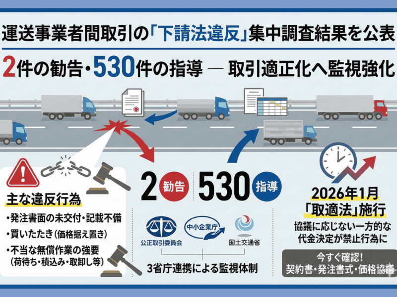 2件の勧告・530件の指導 ― 取引適正化へ監視強化 公正取引委員会および中小企業庁は、運送事業者間の取引における下請法違反被疑行為 について集中調査を実施し、2件の勧告および530件の指導 を行った …