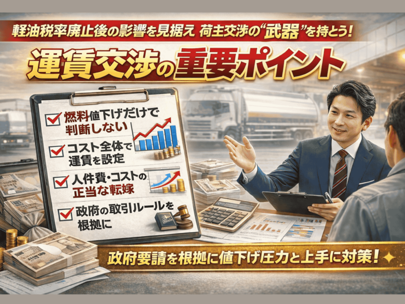 2026年4月1日から予定されている軽油引取税の暫定税率廃止に伴って、荷主側や元請運送事業者から運賃引下げの要請が出される可能性が高まっています。これに対し、政府(三者連名:国土交通大臣・中小企業庁長 …