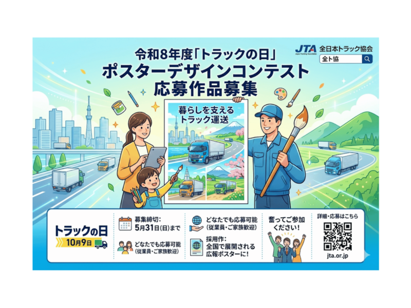 全日本トラック協会(全ト協)では現在、10月9日の「トラックの日」に向けて、令和8年度のポスターデザインコンテストの応募作品を募集しています。 本コンテストは、私たちの暮らしと経済を支えるトラック運送 …