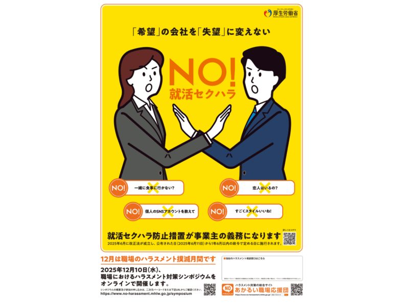 厚生労働省は、12月を「職場のハラスメント撲滅月間」と定め、ハラスメントのない職場づくりに向けた集中的な広報・啓発活動を実施しています。 特に本年度は、令和7年6月に「労働施策総合推進法等の一部改正法 …